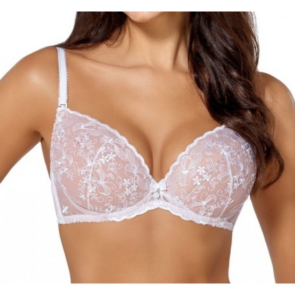 Жіночий бюстгальтер пуш-ап з ніжної білої сітки, прикрашений вишивкою, на підкладці з пудрово-бежево..