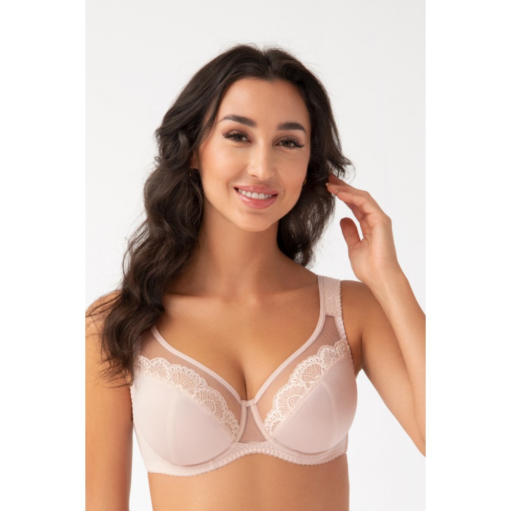 Usztywniany biustonosz z delikatnej siateczki zdobionej efektownym haftem. Miseczki podszyte tkaniną..