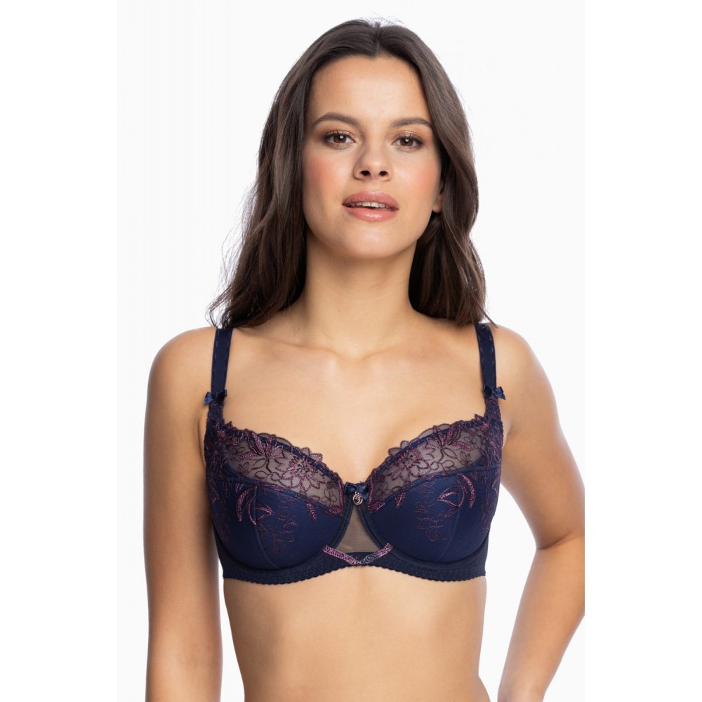Biustonosz typu semi soft. Miseczki półusztywnione, zewnętrzna warstwa z delikatnej siateczki z haft..