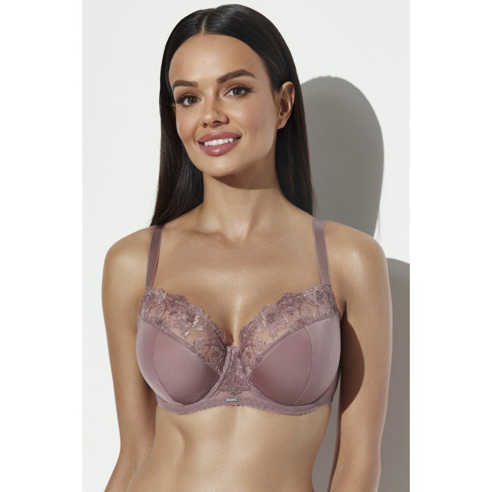 Biustonosz typu semi soft. Miseczki półusztywnione, zewnętrzna warstwa z delikatnej siateczki z haft..