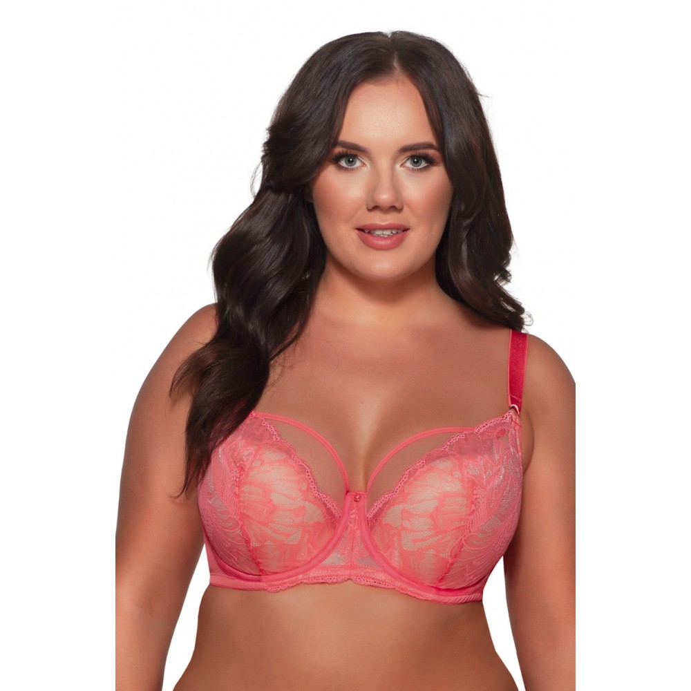 Biustonosz typu semi soft AV 2075,  miseczki zbiorą piersi ku sobie i estetycznie je uformują w dekolcie, a elastyczny obwód i sprężyste ramiączka ustabilizują biustonosz we właściwym miejscu, skutecznie zapobiegając jego przesuwaniu się. Misterna, kwiatowa koronka położona na cielistym tiulu pięknie podkreśli letnią opaleniznę, a koralowe lamówki zmysłowo obramują zarys ponętnego biustu. Dla efektownego uzupełnienia setu dobierz koniecznie zmysłowe figi!