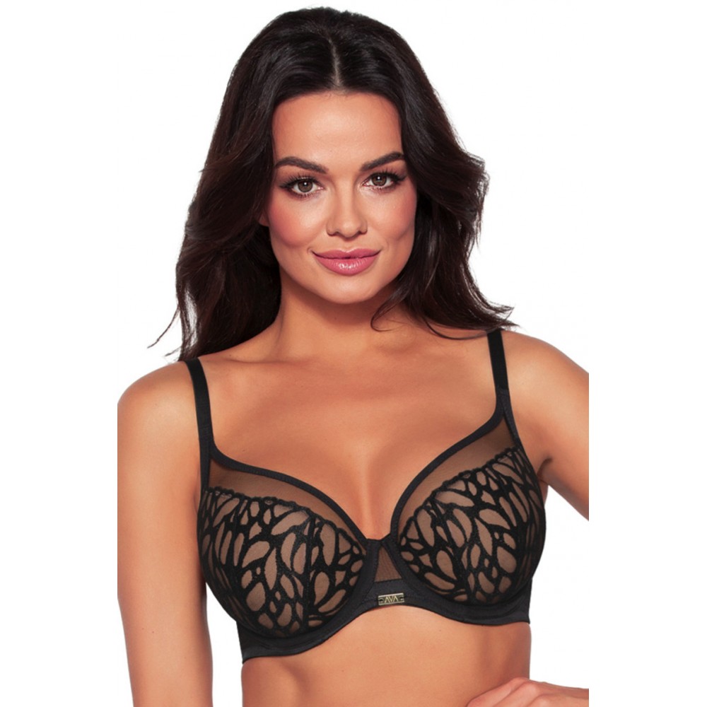 Biustonosz typu push up z wyjmowanymi wkładkami. Górna część miseczek została przedłużona prześwitującą siateczką co nadaje całości konstrukcji lekkości. Usztywnioną część misek biustonosza zdobi czarny haft. Ramiączka nieodpinane, brak fiszbin bocznych.