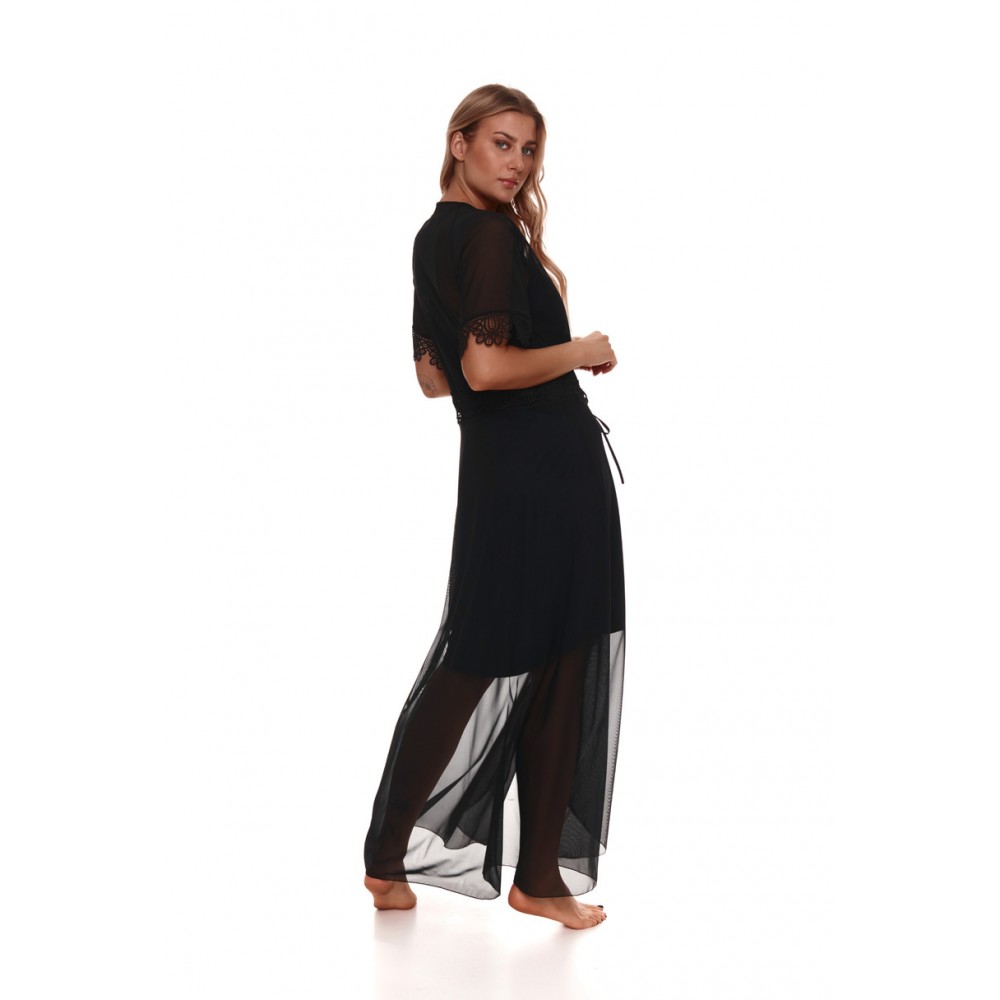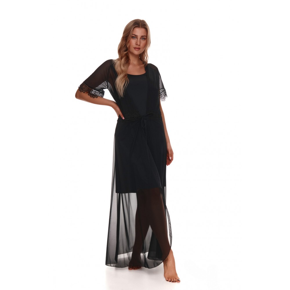 Класичний довгий пеньюар з короткими рукавами, що зав'язується на талії. Виготовлений з прозорої сітки, рукави та пояс халата оздоблені гіпюровим мереживом, що надає всьому виробу унікального характеру.