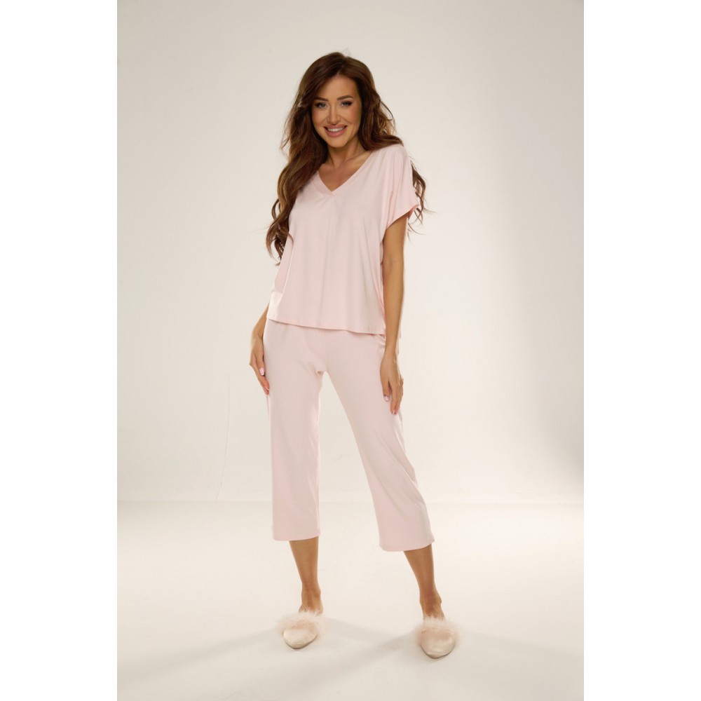 Жіноча піжама з короткими рукавами вільного та зручного крою, виготовлена з м'якої віскози з додаванням еластану. Штани з віскози в рубчик, довжина 3/4, у тон.