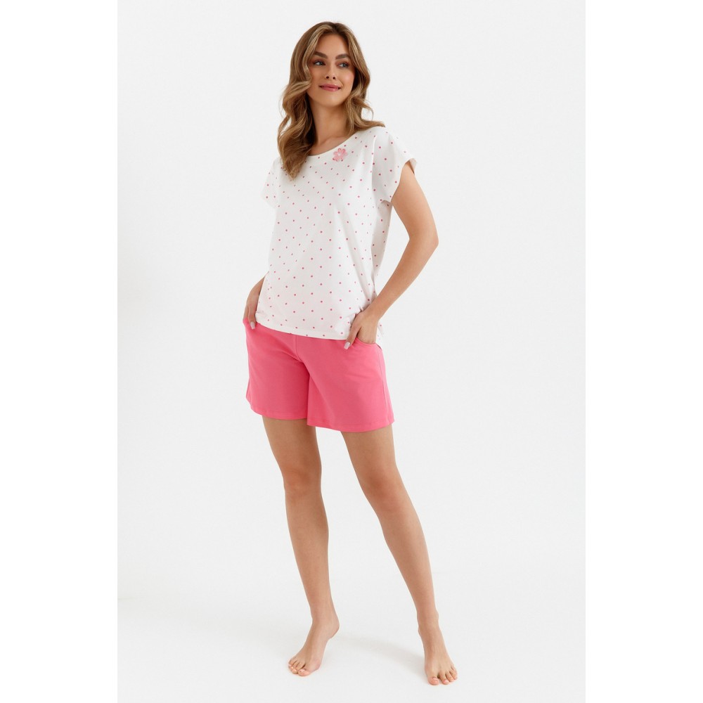 Чарівна та зручна жіноча піжама у ніжному, жіночному стилі. Виготовлена з високоякісного трикотажу з еластаном, вона забезпечує чудову м'якість та повітропроникність. Блузка кольору екрю прикрашена ніжним візерунком у дрібний рожевий горошок. Оверсайз-крій гарантує повну свободу рухів, а короткі рукави та ретельно продуманий круглий виріз горловини з вишитою квіткою з тюлю додають нотку шарму. Комплект включає довші рожеві шорти з практичними кишенями. Це поєднання комфорту та стилю ідеально підходить для тихих вечорів та лінивих ранків.
