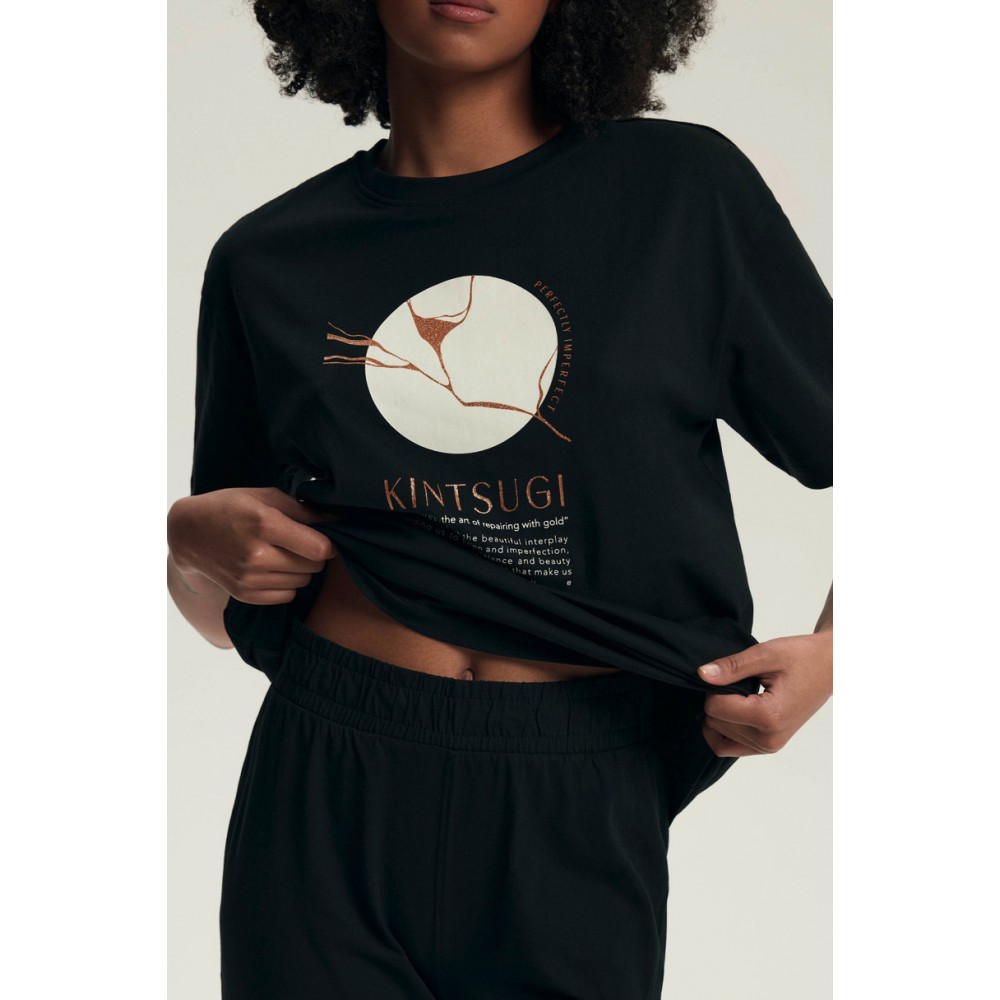 Жіноча піжама DAIROKU 43728 AW25 ідеально підходить для теплих вечорів та затишного домашнього відпочинку. Виготовлена зі 100% дихаючої бавовни, вона забезпечує природний комфорт, м'якість та повну свободу рухів. Її мінімалістичний стиль підкреслює принт, натхненний японським мистецтвом кінцугі , яке підкреслює красу в недосконалостях.