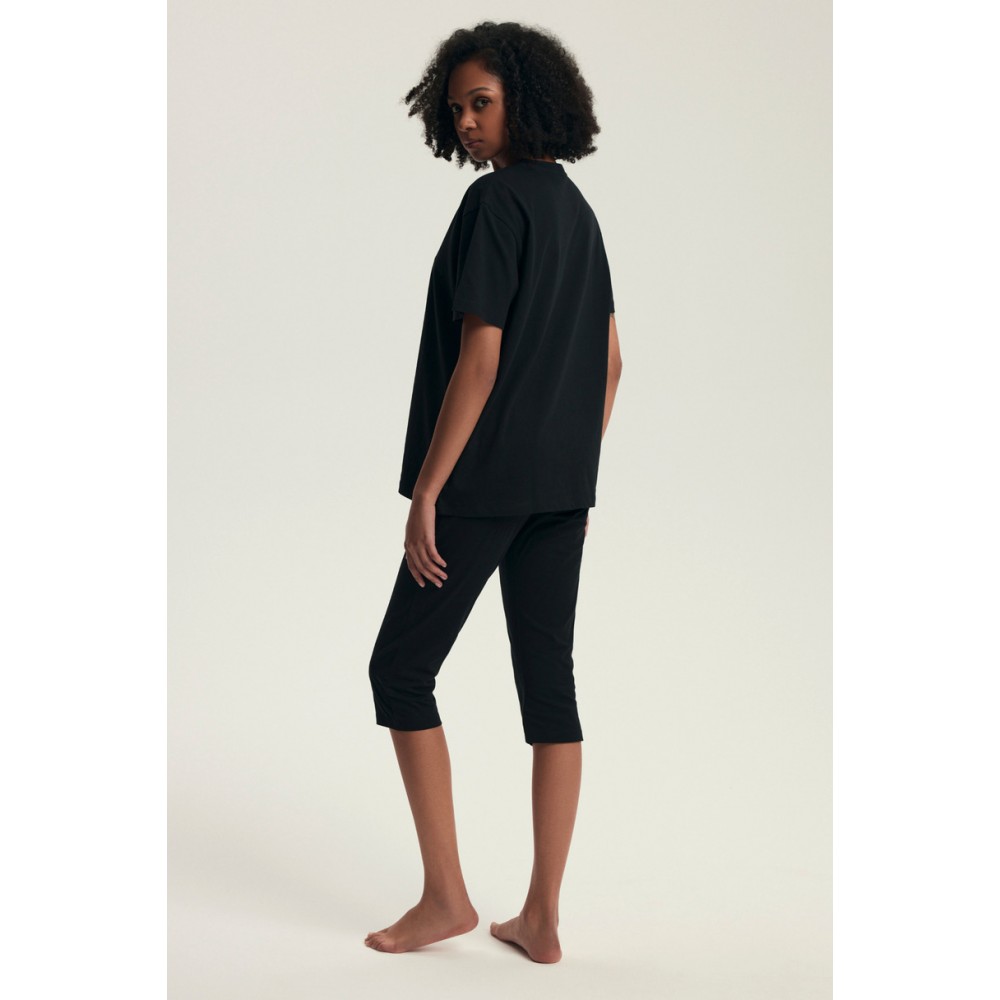 Комплект складається з вільної футболки з короткими рукавами та штанів довжиною 3/4 з еластичним поясом для комфортної та не обмежуючої посадки. Елегантний чорний колір робить його ідеальним не лише для використання як піжама, але й як стильний одяг для дому.