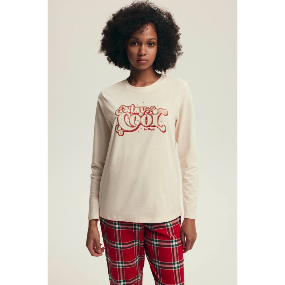 Піжамний топ — це кремова блузка з довгими рукавами, прикрашена модним принтом «Stay Cool – Be Happy» , який створює позитивний настрій. Топ виготовлений зі 100% бавовни.
