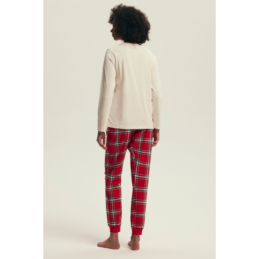 Нижня частина комплекту – червоні фланелеві штани з класичним картатим візерунком з гумкою на талії та штанинах , що забезпечує ідеальну посадку та надійну фіксацію під час сну. Фланелевий матеріал м’який, приємний на дотик та ідеально підходить для осінньо-зимового сезону.