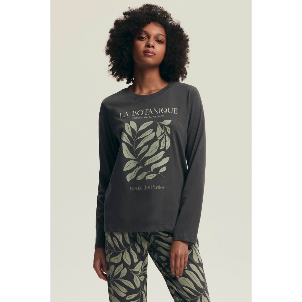 Блузка з довгими рукавами прикрашена ботанічним принтом з написом «La Botanique – Beauté des Plantes», який гармонійно доповнює квітковий принт на штанях. Довгі штани мають еластичний пояс і зручний крій для максимальної свободи рухів та щільного прилягання, що не стискає фігуру.