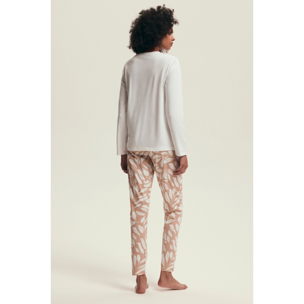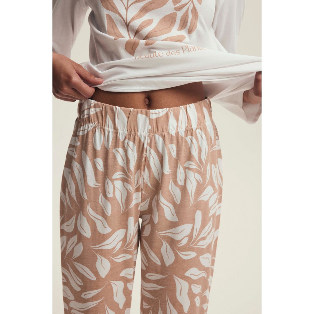 Блузка з довгими рукавами кольору екрю прикрашена ботанічним принтом з написом «La Botanique – Beauté des Plantes », що підкреслює природний характер дизайну. Штани пастельного бежевого кольору з візерунком у вигляді великого листя мають еластичний пояс для ідеальної посадки.