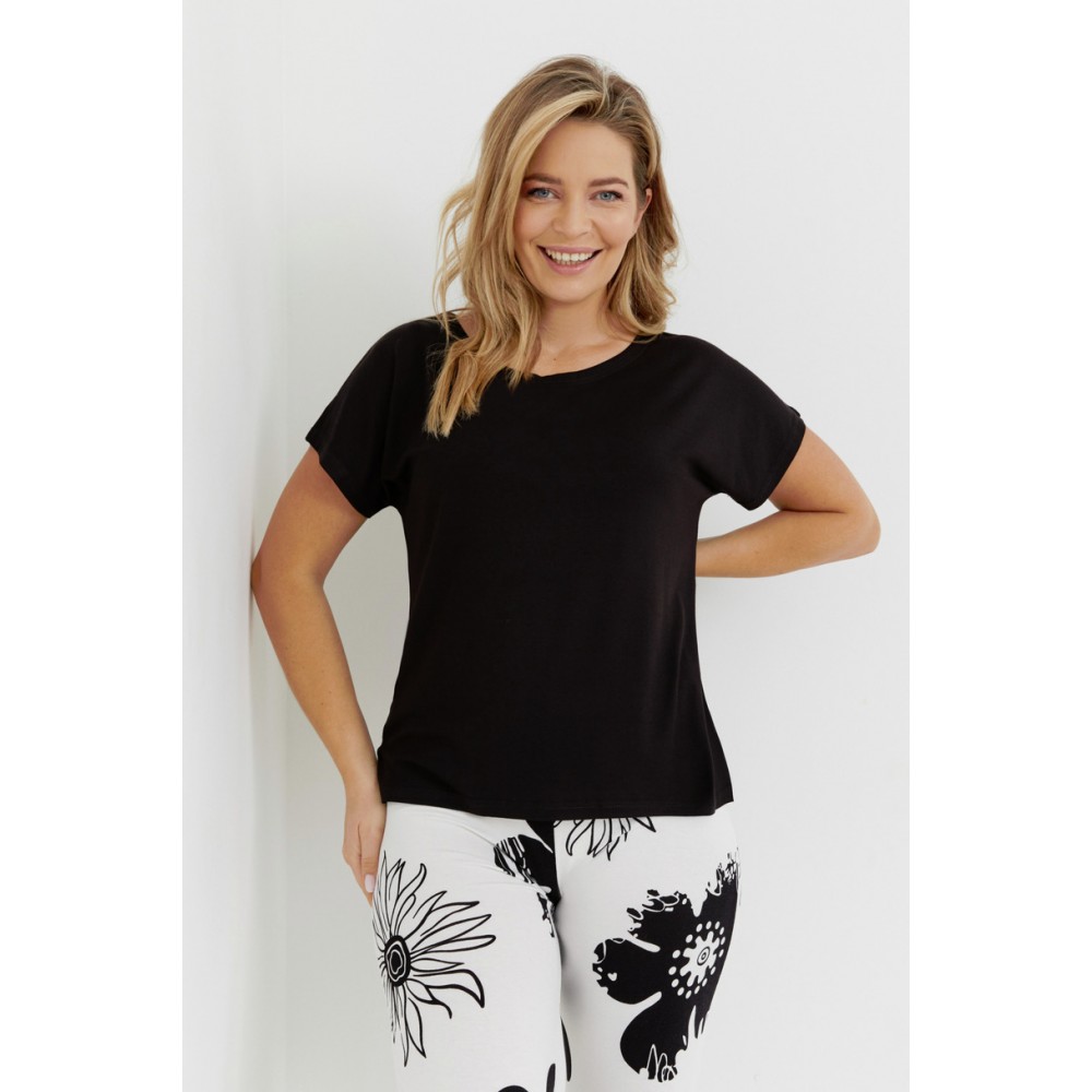 • Жіноча піжама з короткими рукавами з високоякісної віскози. Круглий виріз горловини. У комплекті капрі. склад: 94% віско..