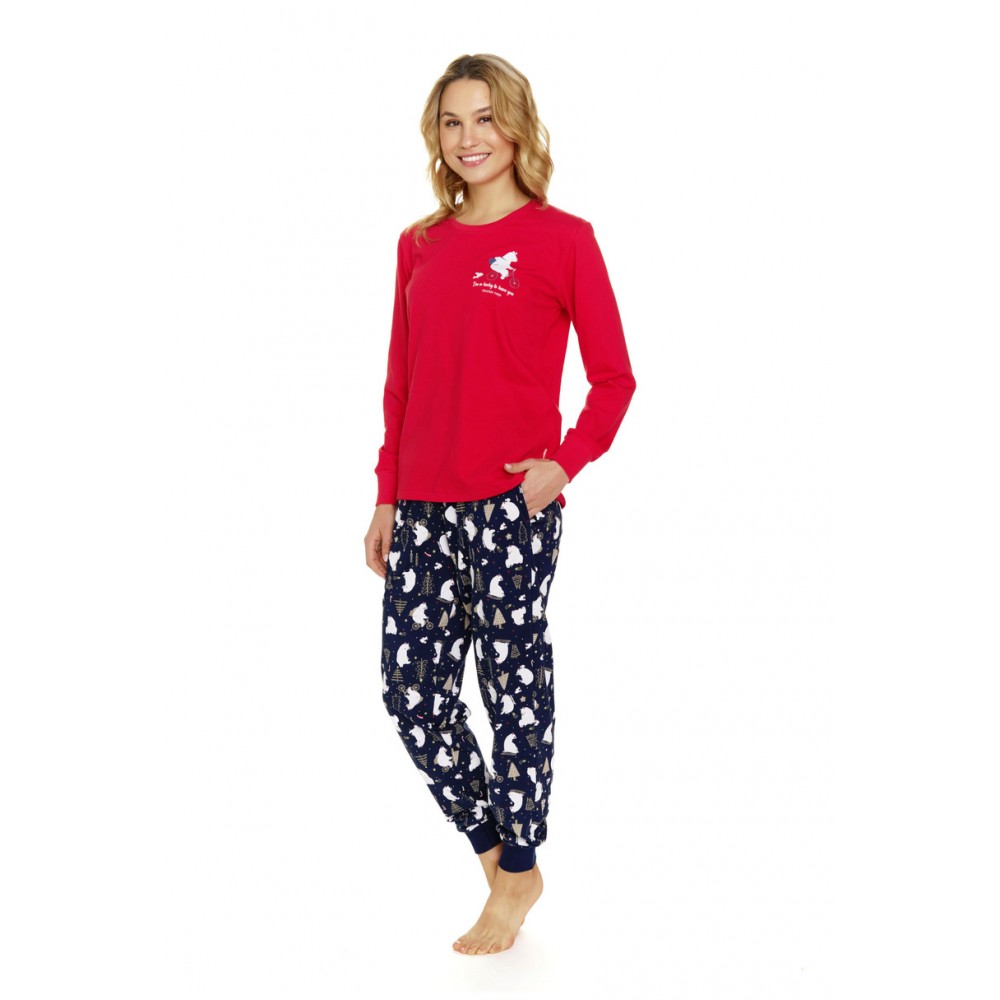 Жіноча піжама з високоякісної м'якої бавовни. Футболка з довгими рукавами має яскравий принт спереду. У комплекті довгі штани з візерунком. Горловина, манжети та штанини оздоблені зручними ребристими манжетами.
