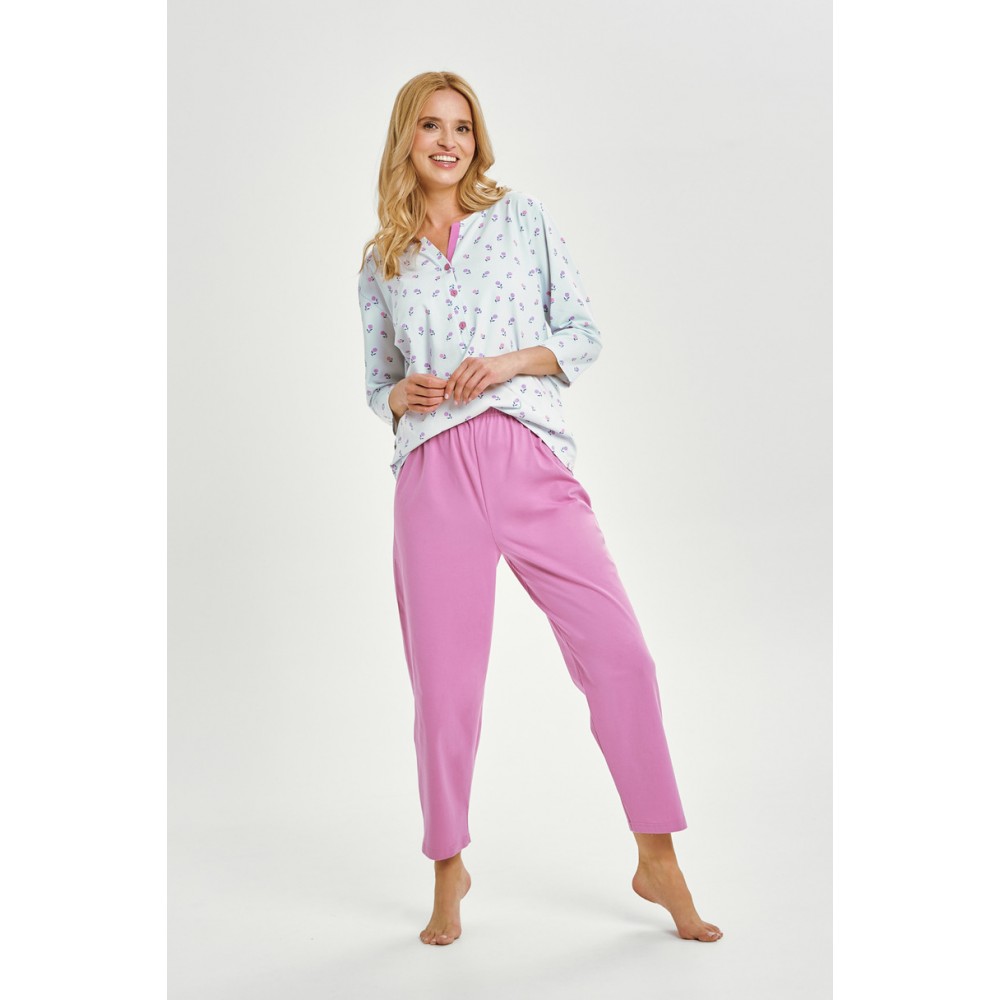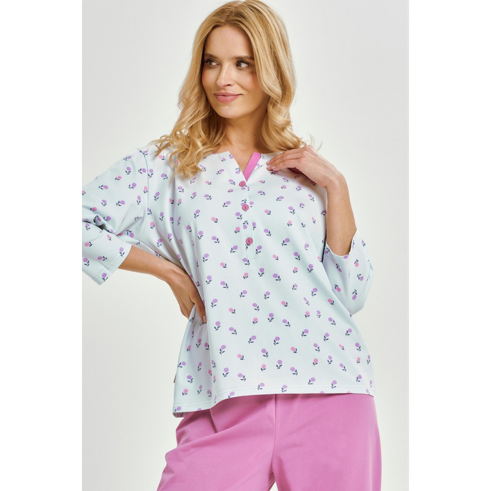 Жіноча довга піжама YOLANDA 3446 – це унікальне поєднання комфорту та елегантності. Верх виготовлений з м’якої віскози з візерунком та еластаном, що ніжно облягає тіло та забезпечує повну свободу рухів. Рукава 7/8 та виріз на ґудзиках додають витонченого шарму та функціональності. Довгі штани, виготовлені з високоякісної 100% бавовни, гарантують тепловий комфорт та комфорт протягом усієї ночі. Ідеальний піжамний комплект для жінок, які цінують стиль та натуральні матеріали.
