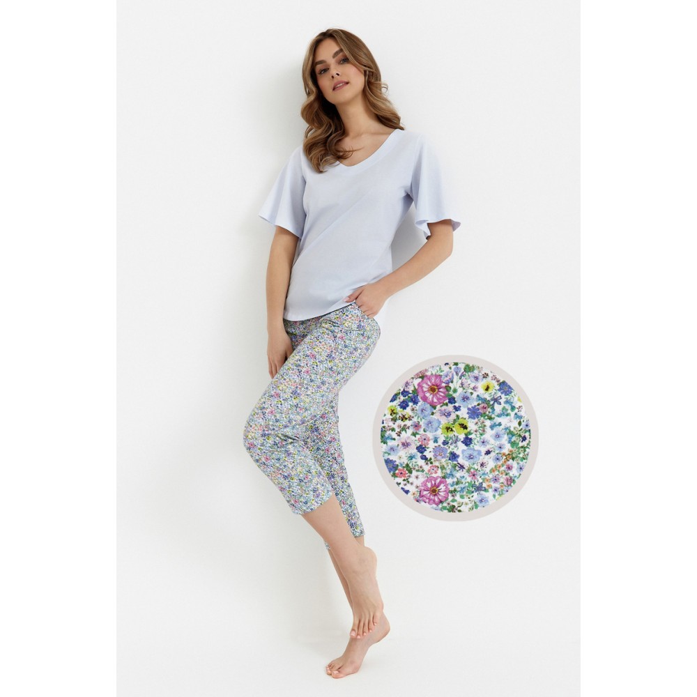 Ця модель має короткі рукави та штани довжиною 7/8, що робить її ідеальним вибором як для теплих вечорів, так і для зручного домашнього одягу. Практичні кишені додають функціональності, дозволяючи зберігати дрібні речі. Витончений, жіночний дизайн робить піжаму стильною, забезпечуючи максимальний комфорт.