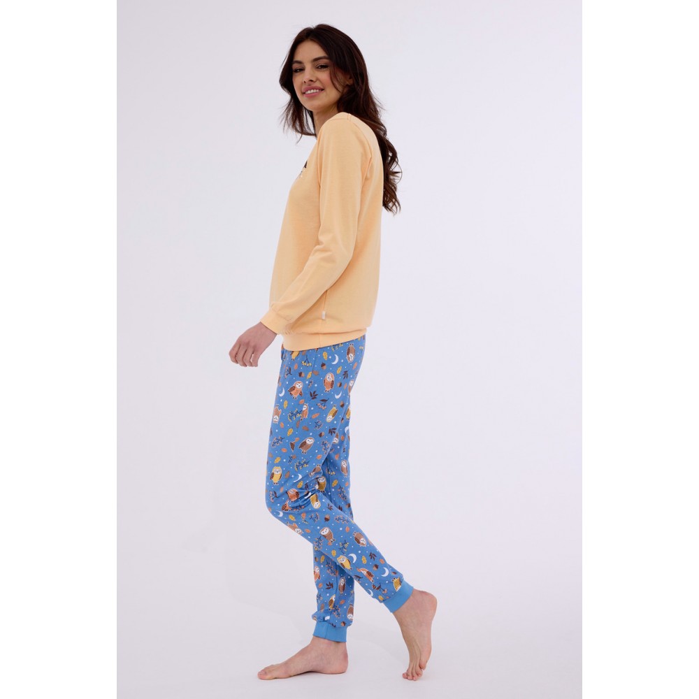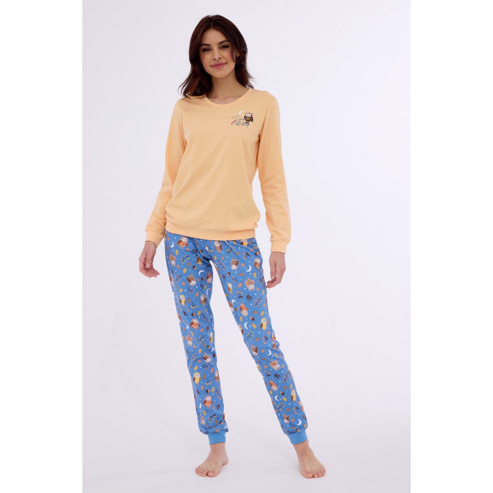Жіноча піжама з м'якої бавовни. Блузка має довгі рукави з ребристими манжетами, круглий виріз горловини та ніжний принт на грудях. Комплект включає візерунчасті довгі штани з ребристими манжетами. Упаковано в коробку.