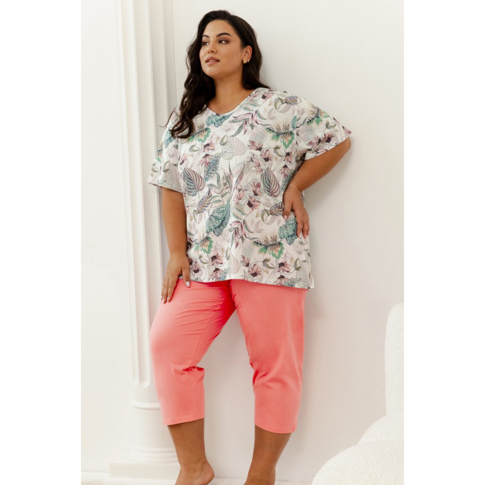 Жіноча піжама 3369 Renny від Taro поєднує в собі комфорт та елегантність. Виготовлена зі 100% м'якої, дихаючої бавовни, вона забезпечує максимальний комфорт під час сну. Візерунчастий топ з короткими рукавами та V-подібним вирізом підкреслює жіночний стиль, а однотонні штани довжиною 3/4 забезпечують свободу рухів. Ідеально підходить для будь-якої пори року, вона чудово підійде як для комфортного сну, так і для розслаблюючого домашнього вбрання.