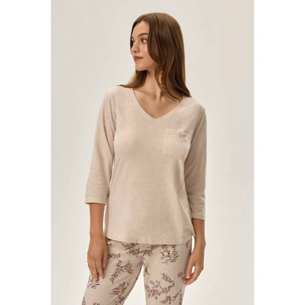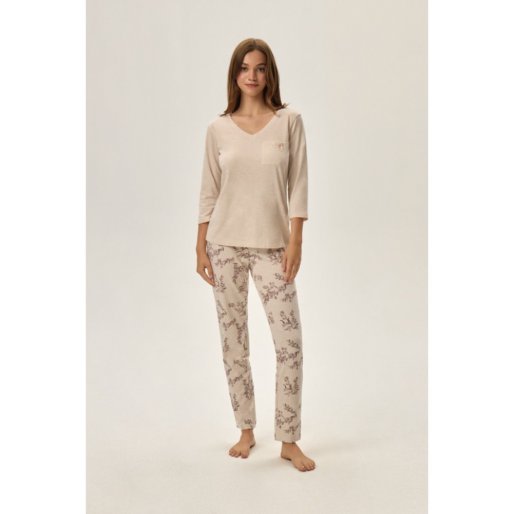 • Жіноча піжама з довгими рукавами. V-подібний виріз. Нагрудна кишеня. Довгі штани з візерунком у тон. Склад: 80% бавовна,..