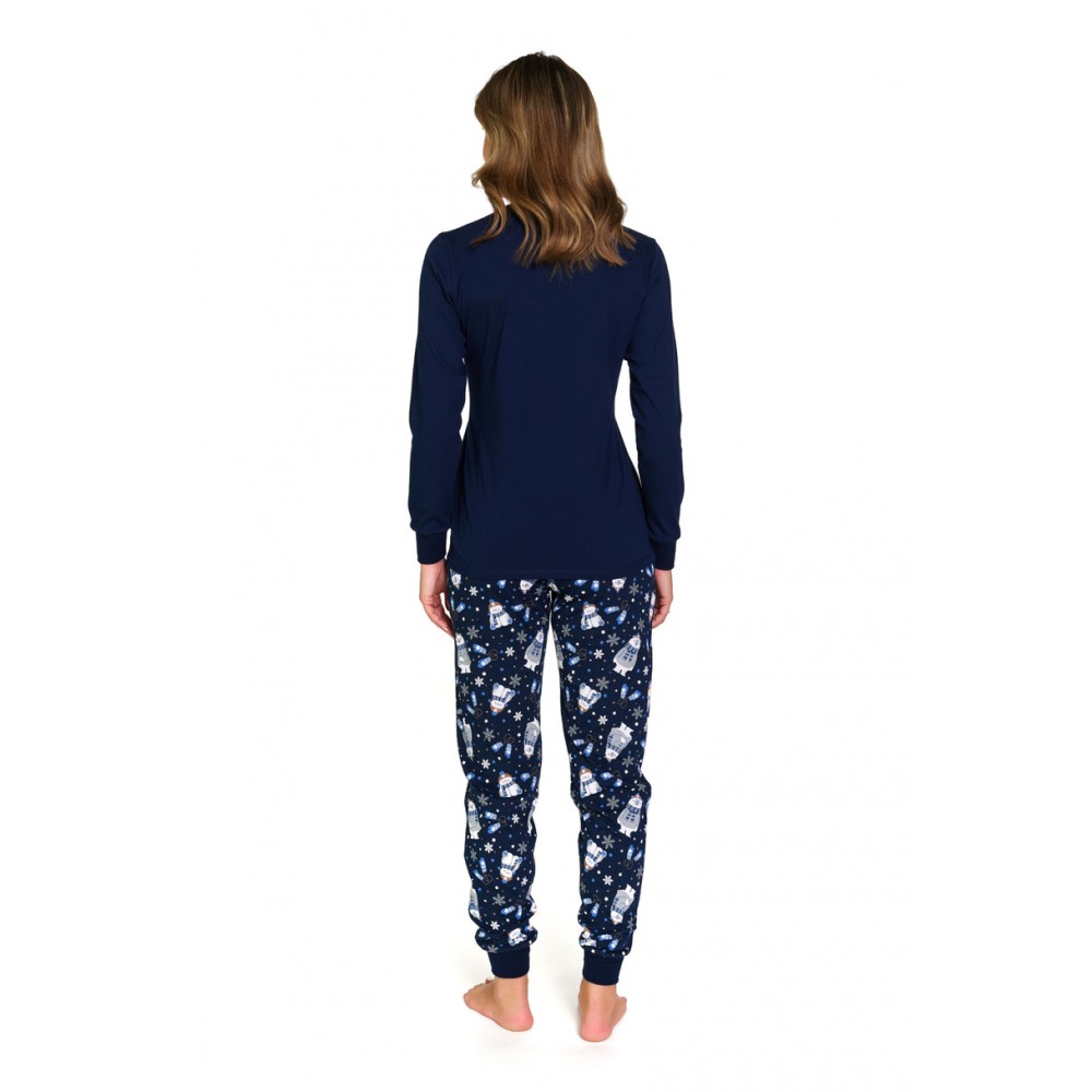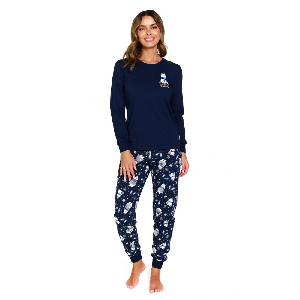 Жіноча піжама Doctor Nap PM.7337 Cozy Bear BIG призначена для жінок, які цінують комфорт, якість та чарівний дизайн. Виготовлена зі 100% м'якої, дихаючої бавовни, вона гарантує комфорт та ніжна до шкіри. Футболка з довгими рукавами у відтінках синього та темно-синього прикрашена чарівним принтом ведмедика, що надає комплекту затишку. У комплект входять довгі штани. Класичний крій забезпечує свободу рухів, а натуральний матеріал робить цю піжаму ідеальною як для прохолодних вечорів, так і для лінивого ранку.