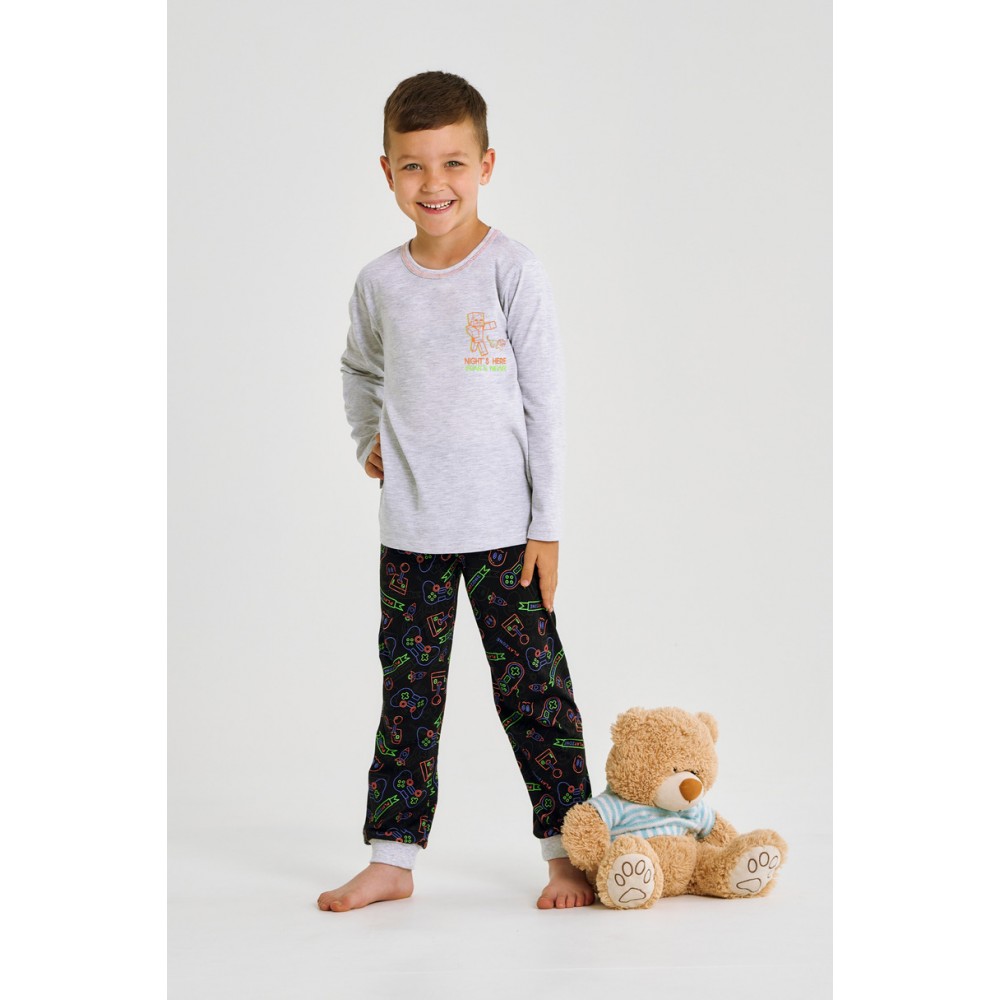Піжамний комплект для хлопчика 3497 Liam від Taro – це практичний та зручний комплект, виготовлений з високоякісної натуральної бавовни. Футболка з довгими рукавами має модний принт спереду, що додає їй сучасного хлоп'ячого вигляду. Комплект також включає довгі штани з цікавим візерунком та еластичними манжетами. Зручний еластичний пояс забезпечує ідеальну посадку та комфорт під час сну або відпочинку вдома. Цей комплект, доступний у розмірах 92-116, ідеально підійде для молодших хлопчиків, які цінують комфорт та свободу рухів.