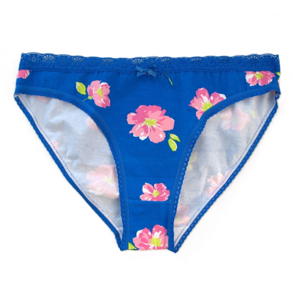 • Жіночі труси спортивного крою з високоякісної м'якої бавовни з 5% еластану з квітковим візерунком та мереживною обробкою..