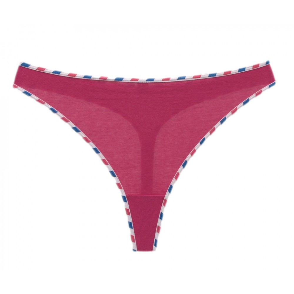 Жіночі стрінги, виготовлені з високоякісної бавовни з 5% еластану. Оздоблені різнокольоровою окантовкою. Доступні парами в різних кольорових комбінаціях: синьому, червоному та рожевому.