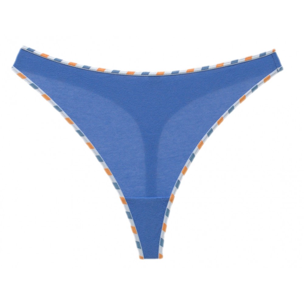 Жіночі стрінги, виготовлені з високоякісної бавовни з 5% еластану. Оздоблені різнокольоровою окантовкою. Доступні парами в різних кольорових комбінаціях: синьому, червоному та рожевому.