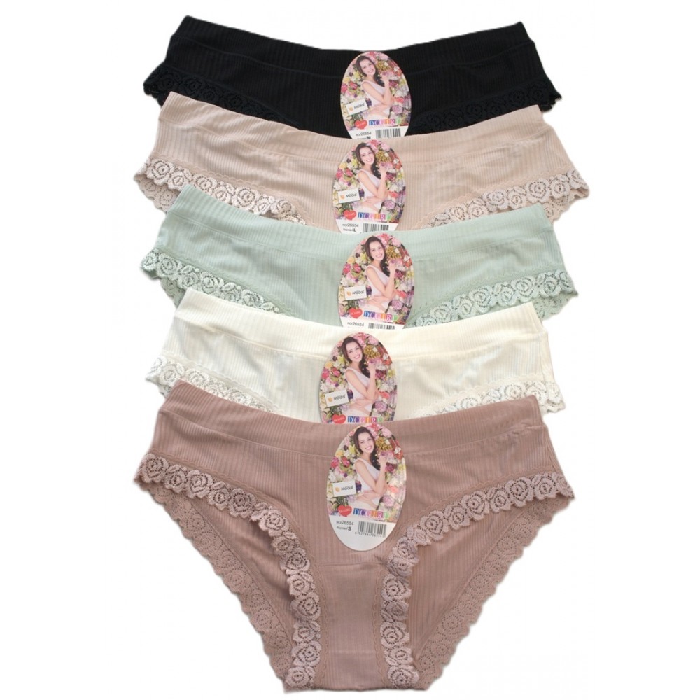 Жіночі труси з високоякісного, м'якого модалу. Гарних, приглушених кольорів, оздоблені мереживом. Упаковані в міксі 12 кольорів. Розміри в упаковці (S, M, L, XL). Склад: 94% модал, 6% еластан.