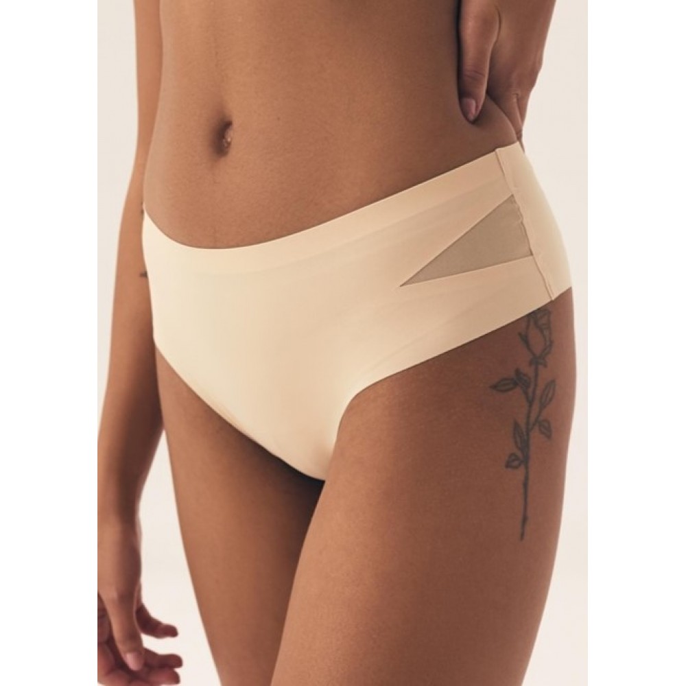 • Жіночі трусики з гладенької, ніжної мікрофібри з трохи вшитою зоною стегон. Боки оздоблені сітчастими вставками, та плос..