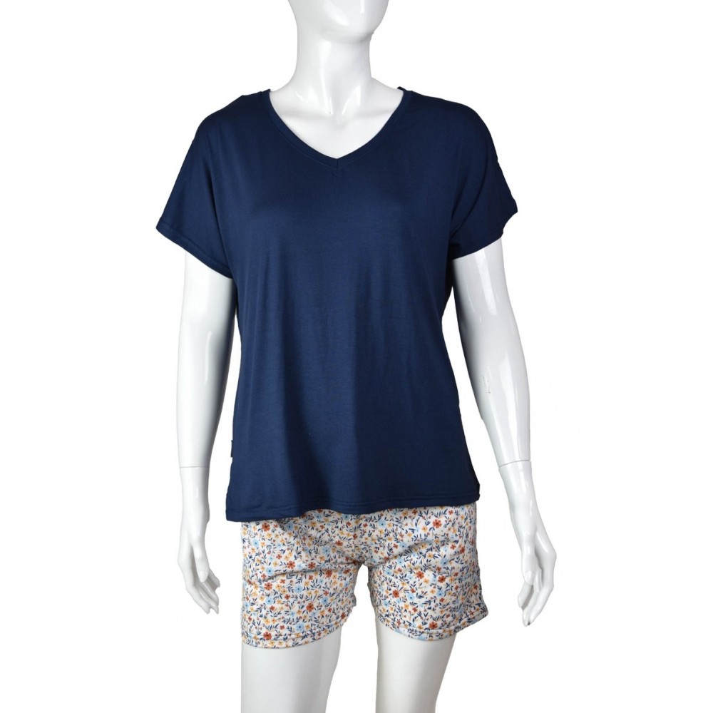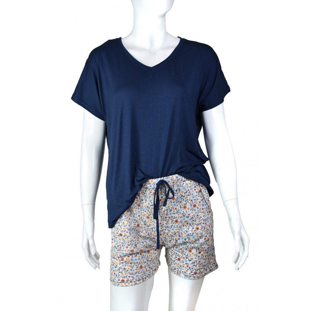 Жіноча піжама з короткими рукавами та шортами. Однотонний топ у поєднанні з квітковими шортами.