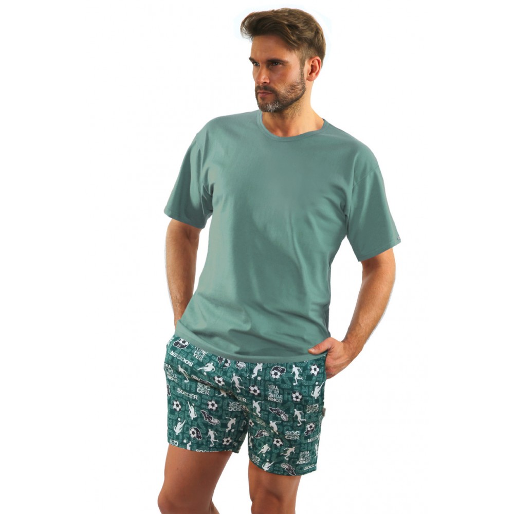 Чоловіча бавовняна піжама. У комплекті однотонна футболка з короткими рукавами та візерунчасті шорти з кишенями.