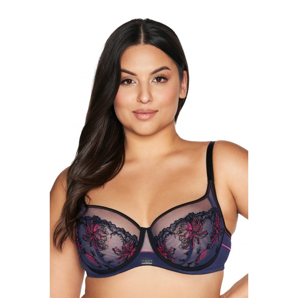 М'які чашечки виготовлені з міцного фатину, прикрашені унікальною квітковою вишивкою яскравих кольорів. Глибокий темно-синій колір додає чарівності. Декоративна перемичка та розділена еластична спинка, доповнені декоративними швами, ідеально пристосовуються до фігури, забезпечуючи не лише красу, але й комфорт.