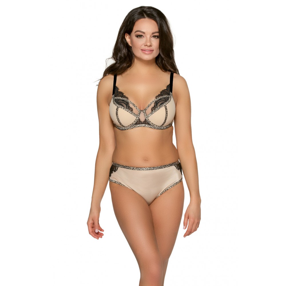 Felis — справжня хижачка: вона вабить своїм тваринним принтом, спокушає прозорими деталями та вражає мереживом. Нижня частина цієї напівм'якої чашки підкладена ніжним пінним матеріалом та бавовною, а верхня частина виготовлена з нюдового тюлю, оздобленого чорним мереживом з романтичними віями — все це створено для того, щоб підкреслити жіночні форми. Прозорі деталі візуально зменшують вагу бюстгальтера, а цяткові бретельки додають нотку чуттєвості.