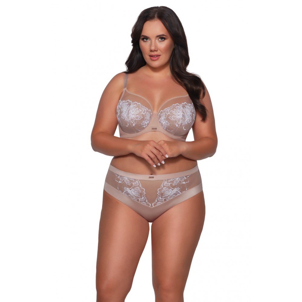 Biustonosz miękki z beżowymi tiulowymi miseczkam , na które naszyty został biały haft, biustonosz komfortowo zbieraj i podtrzymuje biust, zmysłowo eksponując go w dekolcie. Piękny odcień beżu podkreśla koloryt skóry, uwydatniając detale misternych zdobień.