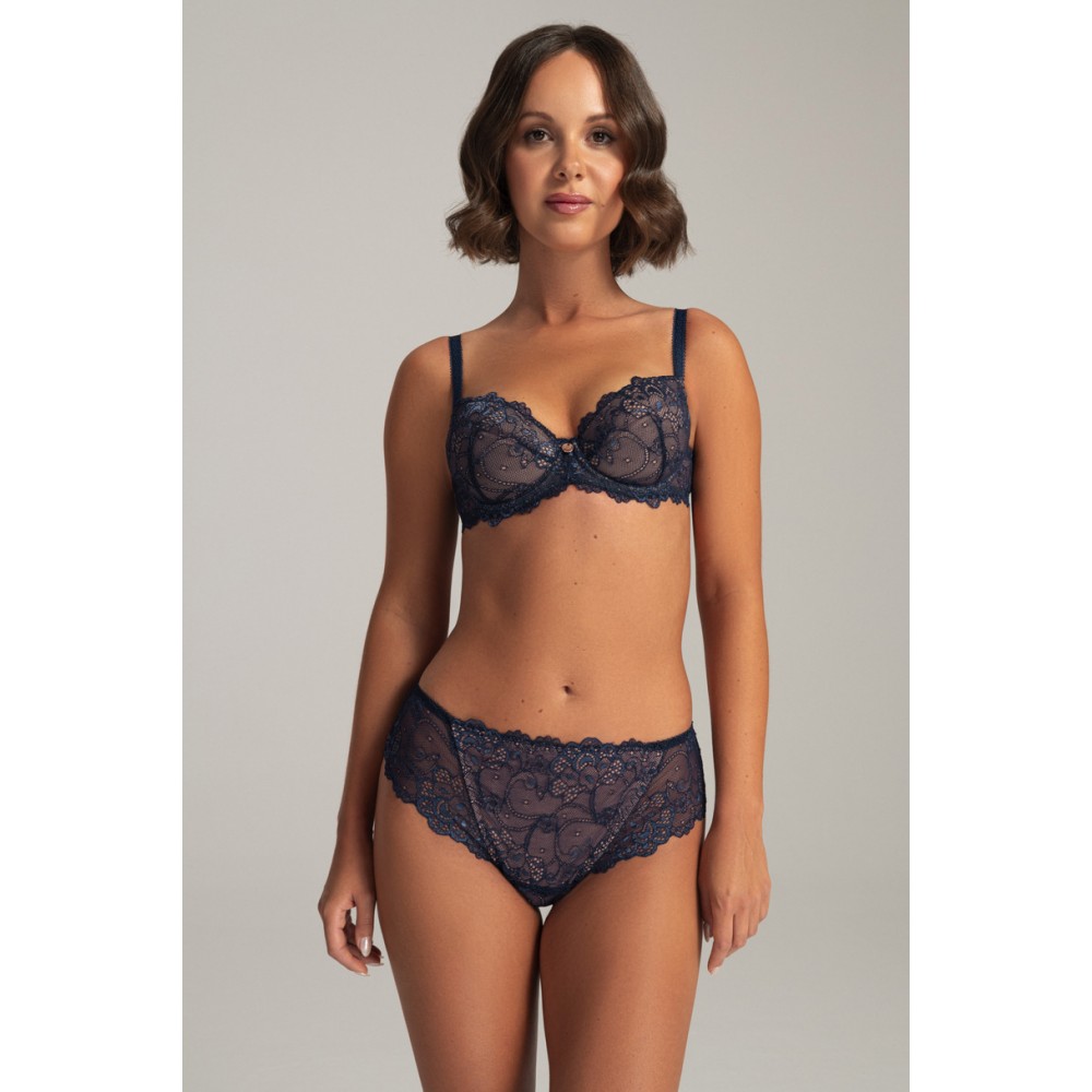 Бюстгальтер AV 2137 Navy Blue від AVA – це чуттєвий вибір для жінок, які цінують елегантність та комфорт в одному. Дизайн пуш-ап чудово підкреслює декольте, додаючи об'єму завдяки знімним вкладишам. Чашечки мають бавовняну підкладку. Ніжні темно-сині мереживні чашечки підкреслюють жіночні вигини, забезпечуючи винятковий комфорт. Незнімні та регульовані бретельки забезпечують ідеальну посадку. Мереживна стрічка та бюстгальтер виготовлені з поєднання високоякісних матеріалів, що гарантують міцність та гнучкість, що робить цей бюстгальтер ідеальним вибором для щоденного носіння та особливих випадків.