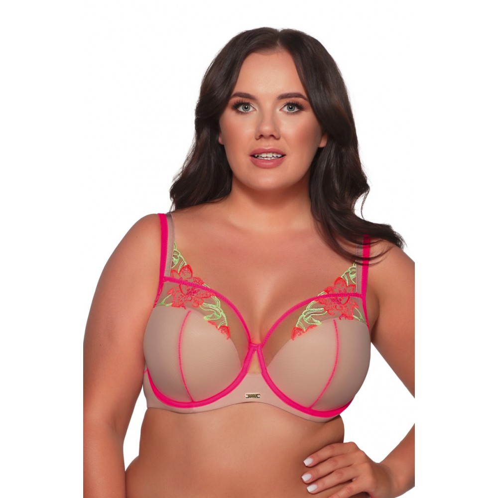 Цей бюстгальтер з напівпідкладкою має м'яку пінопластову підкладку всередині чашечок для оптимального формування, тоді як зовнішня частина покрита нюдовим тюлем, перетинається з рожевими швами, а вражаюча квіткова вишивка в яскравих відтінках тягнеться за межі чашечок. Рожева окантовка обрамляє бюстгальтер, а двоколірні бретельки та вишиті вставки, що тягнуться між бретельками та чашечками, додають легкості та шарму. Дизайн-бестселер забезпечує належну підтримку грудей, підтримку та комфорт, а грайливі трусики ідеально доповнюють образ. Закохайтеся в барвистий Tropea!