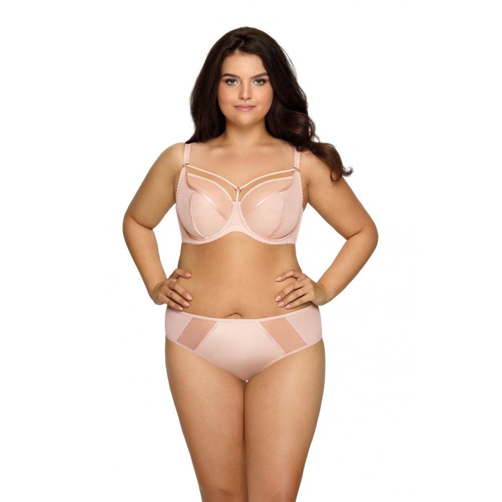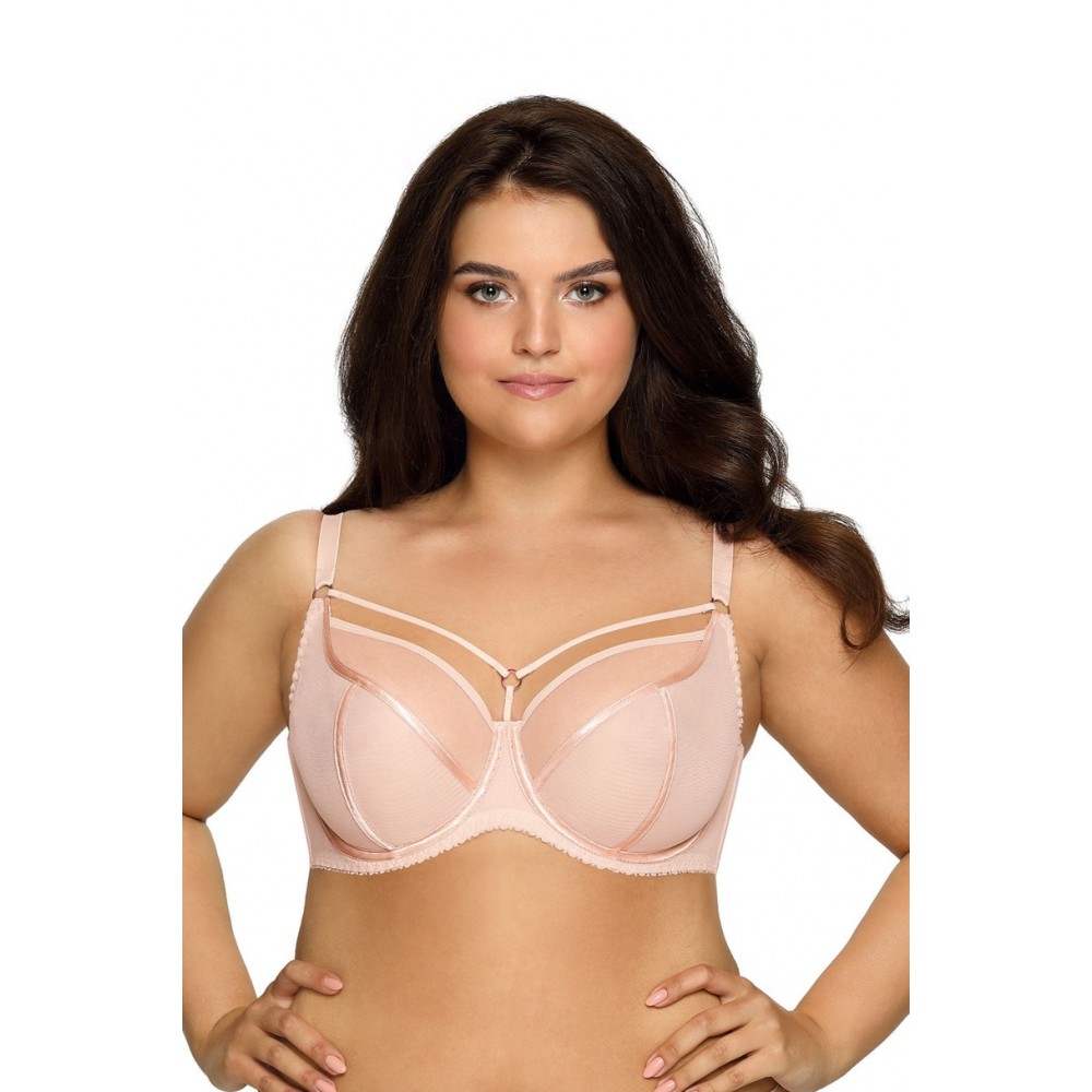 М'який, на основі перевіреної конструкції K-1391. Чашечки, виготовлені з міцного фатину та підкладені м'яким маркізетом знизу, ідеально збирають та формують груди. Еластична прозора стрічка, що підтримується бюстгальтером з бокових кісточок, стабілізує бюстгальтер, утримуючи його на місці, а бретельки відповідного розміру знімають тиск на спину. Атласні стрічки, оздоблені різнокольоровими мерехтливими нитками, та регульовані бретельки з різнокольоровими металевими кільцями додають витонченості.