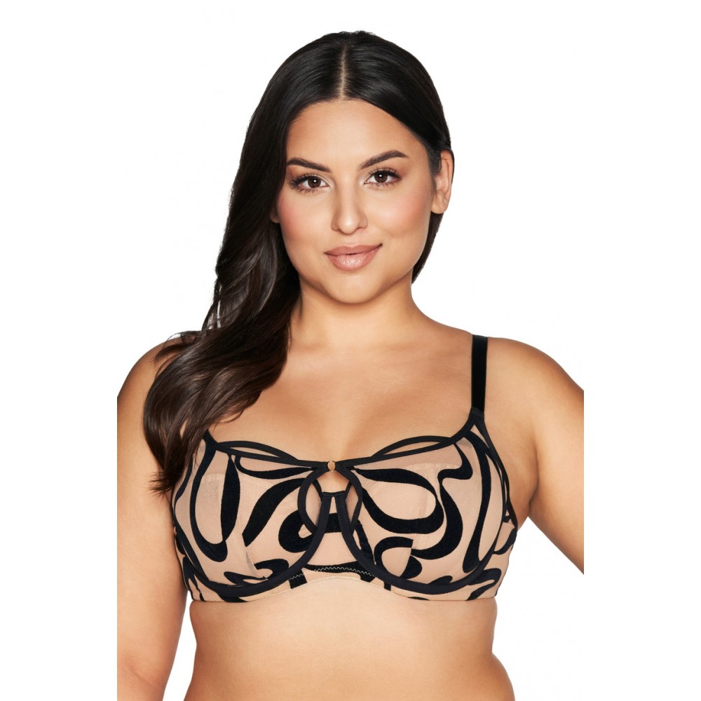 М'які чашечки AV 2125, що підтримуються стабільною бічною панеллю, ідеально збирають груди разом, формуючи та підтримуючи їх. Ефектний еластичний верх, що прикриває традиційну конструкцію, заворожує чорними стрічками, розміщеними на бежевому тюлі. Це унікальне поєднання створює оксамитову м'якість, яку ви буквально відчуваєте на своїй шкірі.