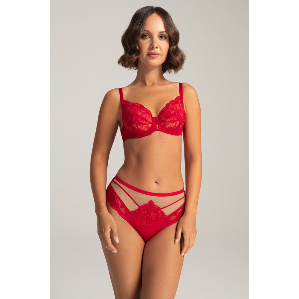 Вогненно-червоний колір на тлі неймовірно жіночної конструкції – це квінтесенція спокусливої Grace. Чашечки, підбиті м’яким бежевим пінним матеріалом та оздоблені червоним мереживом, – це свято для очей та ідеально прикривають бюст. Декоративна цирконієва пряжка, встановлена на стику грудей на мереживному переніссі, – це вишенька на апетитному торті! Чарівна пара трусиків або бразиліан ідеально доповнить комплект.