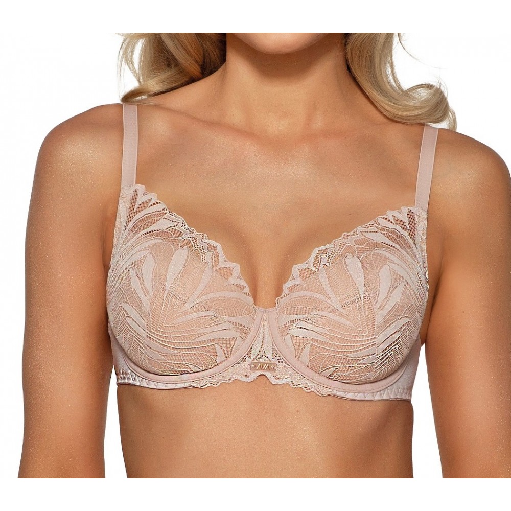 Biustonosz push-up. Miseczki z efektownej koronki, od wewnętrznej strony podszyte beżową gąbeczką, boczki z gładkiej mikrofibry, bez bocznej fiszbiny. Ramiączka nieodpinane. Konstrukcja K-1638. Skład: 88% poliamid, 8% bawełna, 4% elastan.