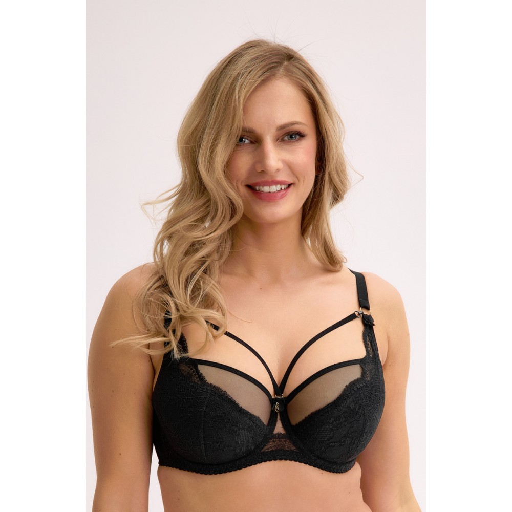 Цей класичний чорний напівм'який бюстгальтер поєднує сучасний дизайн з елегантністю та функціональністю. Модель має м'яку верхню чашечку з прозорого фатину та жорстку нижню чашечку з красивого мережива. Дизайн ідеально збирає та м'яко піднімає груди, надаючи їм природної, округлої форми. Виріз горловини прикрашений чуттєвими бретельками, які не тільки привертають погляд, але й візуально збільшують груди. Спинка виготовлена з еластичного фатину, а бічні кісточки забезпечують стабільність. Підвіска з коштовного каменю на переніссі додає розкішного штриха. Це ідеальний вибір для жінок, які хочуть поєднати комфорт зі сміливим стилем.
