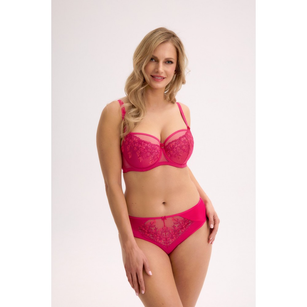 Цей бюстгальтер весна-літо 2010 року в насиченому рожевому відтінку – це квінтесенція жіночності та комфорту. Верхня чашечка виготовлена з легкого, прозорого тюлю, що додає нотку легкості та витонченості. Нижня чашечка виготовлена з ідеально контурного, підтримуючого піноматеріалу, покритого приголомшливою квітковою вишивкою, що забезпечує чудову підтримку та привабливий вигляд. Гумка з м’якої мікрофібри гарантує гнучкість та стабільність протягом дня. Це ідеальна модель для жінок, які цінують поєднання сміливого кольору, романтичних деталей та перевіреної конструкції.