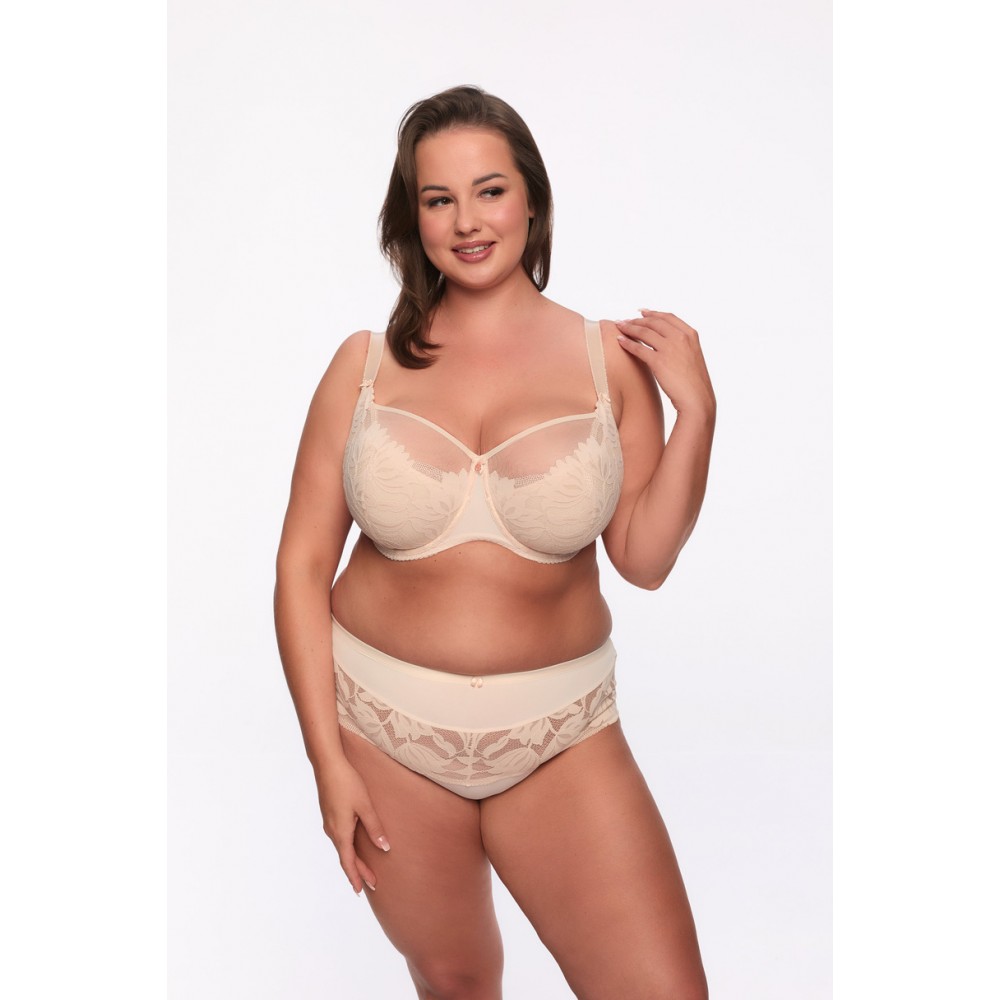 Бюстгальтер для великих грудей має бути не лише функціональним, а й красивим – і ця напівпідкладена модель від GAIA саме для цього. Розроблений для жінок, яким потрібна невелика підтримка, він має чашечки з міцної бежевої сітки, прикрашеної витонченим мереживом, а верхня панель оздоблена бежевою стрічкою, що додає йому вишуканості. Міцна конструкція з боковими кісточками стабілізує та підтримує груди, забезпечуючи комфорт протягом усього дня. Це ідеальне поєднання елегантності, комфорту та ідеальної посадки, яке вам сподобається.
