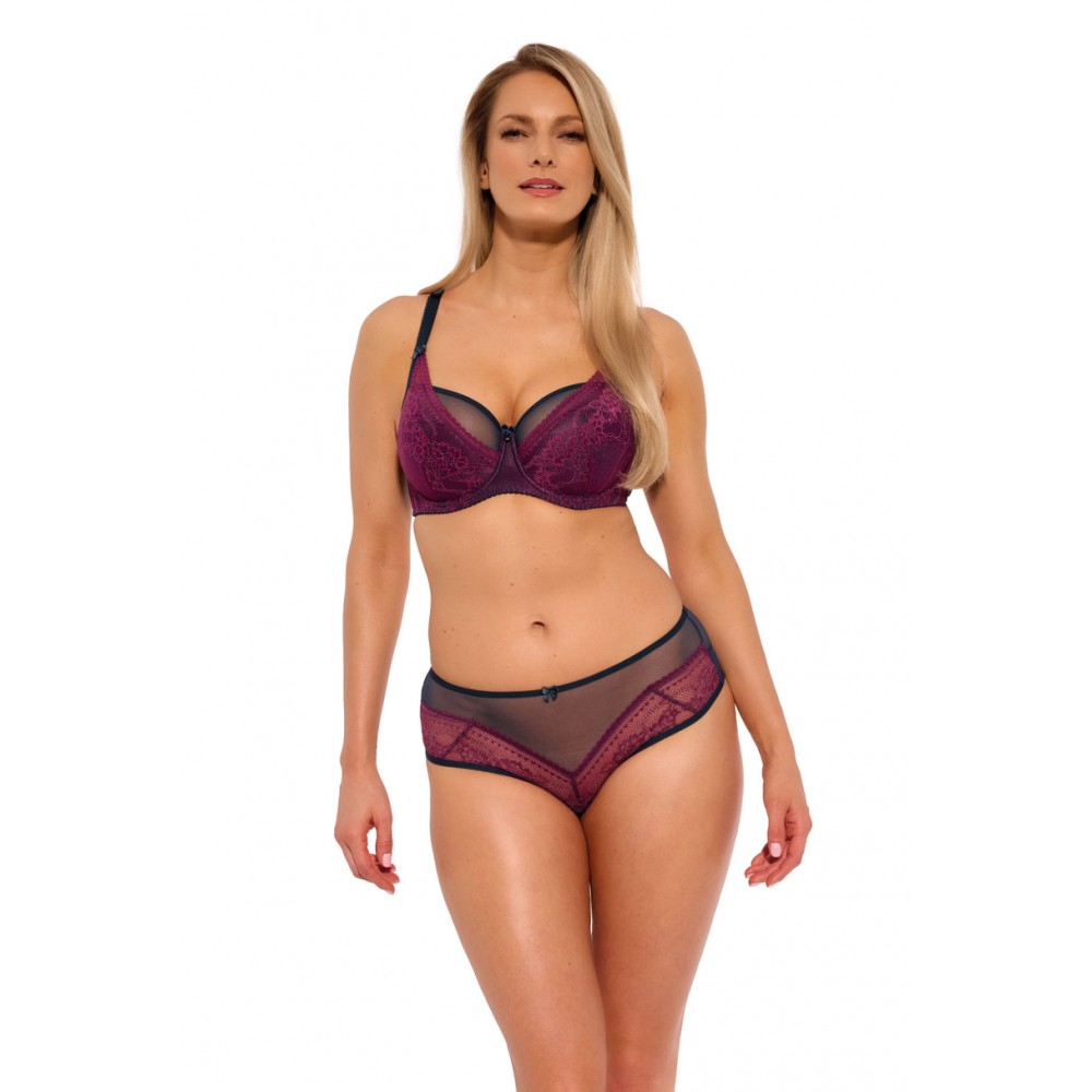Бюстгальтер з напівпідкладкою, верхні чашечки якого виготовлені з ніжного темно-синього фатину, оздобленого стрічкою. Нижні чашечки розширені, повністю закриваючи сосок, а зовнішні чашечки виготовлені з темного мережива кольору фуксії, що тягнеться по бретельці.