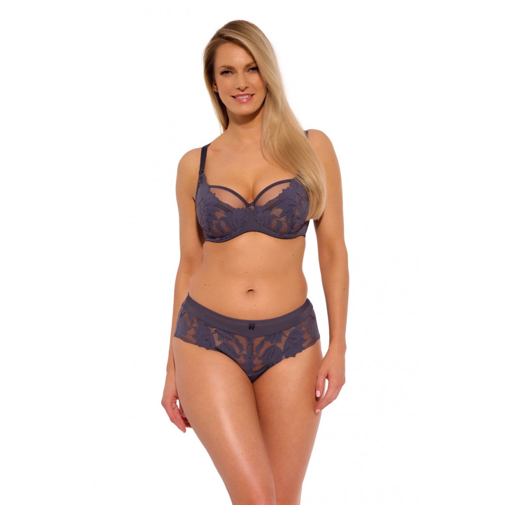М'який, ідеально сконструйований бюстгальтер, який ідеально адаптується до фігури, забезпечуючи винятковий комфорт та підтримку. Чашечки виготовлені з приємного для шкіри графітового мережива, яке чудово прикрашає груди, підкреслюючи їхню форму. Багате мереживо створює вражаючий образ, а поєднання з нерозтяжним тюлем гарантує стабільність та ідеальну посадку. Розроблений спеціально для середнього та великого бюста, цей бюстгальтер забезпечує надійну підтримку та витончений, елегантний вигляд.