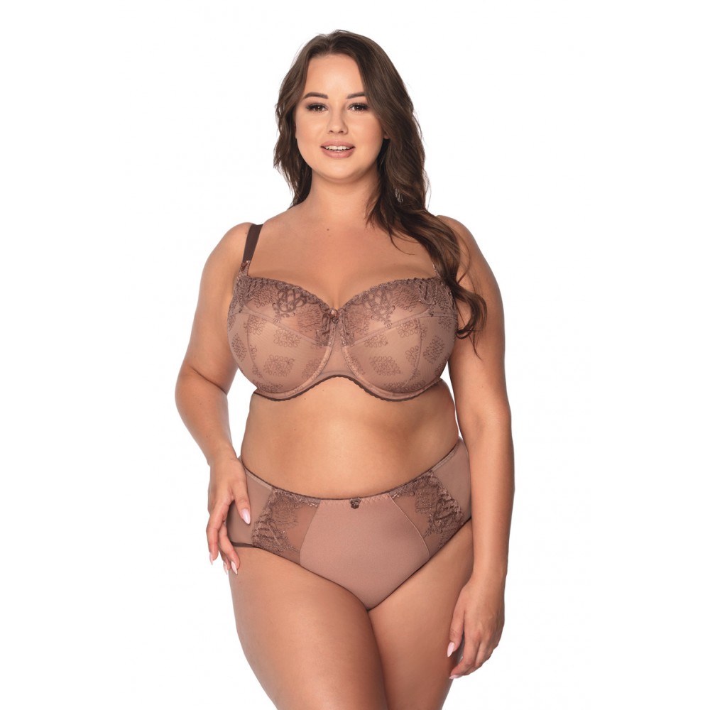 Спеціально розроблений для жінок з великими грудьми, цей бюстгальтер має чашку, обтягнуту вишитою тканиною. Тасьма виготовлена з еластичної, однорідної мікрофібри. Жорстка частина чашки з'єднана з бретельками, що дозволяє бюстгальтеру ідеально підтримувати та підкреслювати форму грудей.