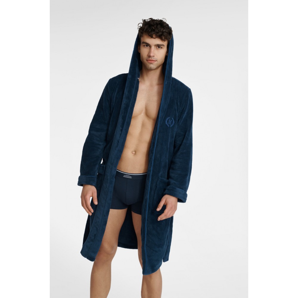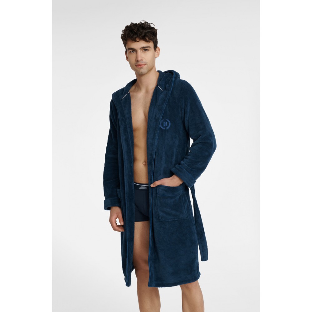 Чоловічий халат Until вирізняється класичним, простим дизайном в елегантному темно-синьому кольорі. Завдяки зручній 100% бавовняній тканині він м'який на дотик навіть після купання. Він також захищає від холоду та забезпечує свободу рухів. Для вашого комфорту халат Until має пояс на зав'язці, капюшон і дві кишені.