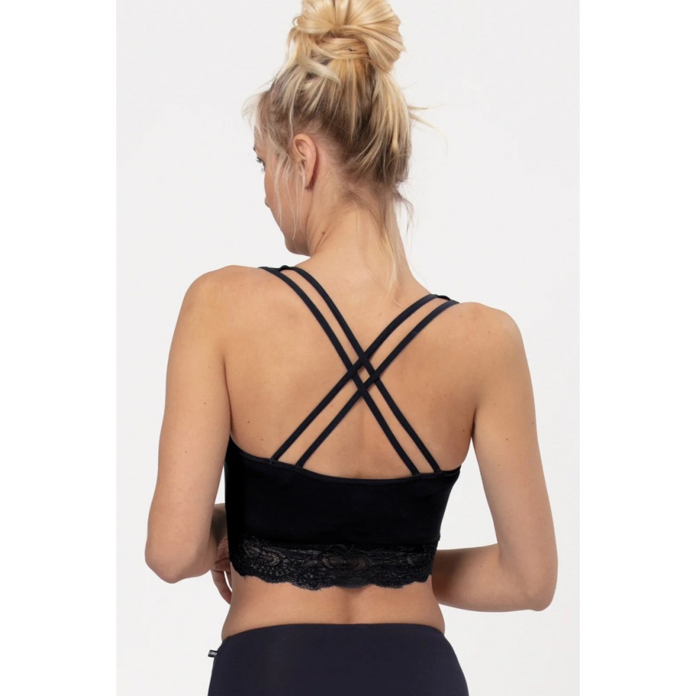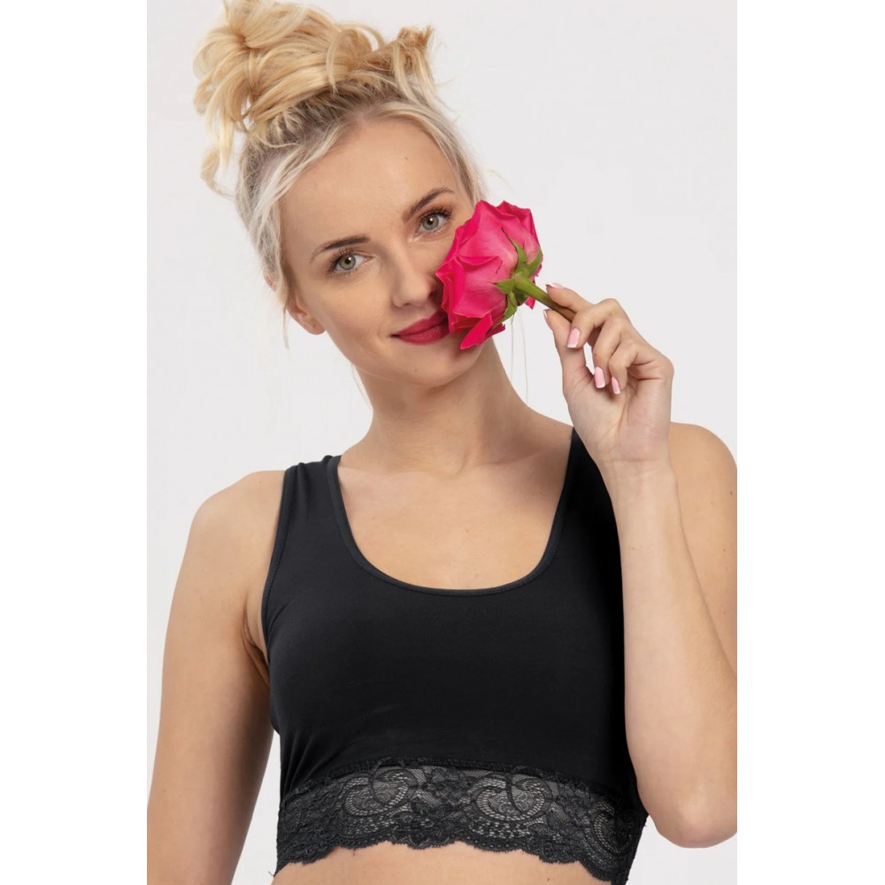 Зручний спортивний топ з бамбука, оздоблений м'яким, еластичним мереживом , для жінок, які цінують комфорт та чудову м'якість цілий рік. Подвійний шар трикотажу спереду ідеально обрамляє груди, створюючи простір для знімної чашки. Під грудьми розміщена м'яка 3-сантиметрова еластична стрічка. Виріз горловини та рукави оздоблені м'якою окантовкою. Бретелі перехрещуються ззаду, запобігаючи їх спаданню та забезпечуючи повну свободу та впевненість у кожному русі. Він практично непомітний, не подразнює та є оксамитовим на дотик. Ідеально підходить для спекотної погоди, дозволяє повітрю циркулювати близько до шкіри, залишаючи заспокійливе відчуття прохолоди. Бамбукове волокно надзвичайно міцне, легке та ніжне, а завдяки додаванню еластану білизна чудово сидить.