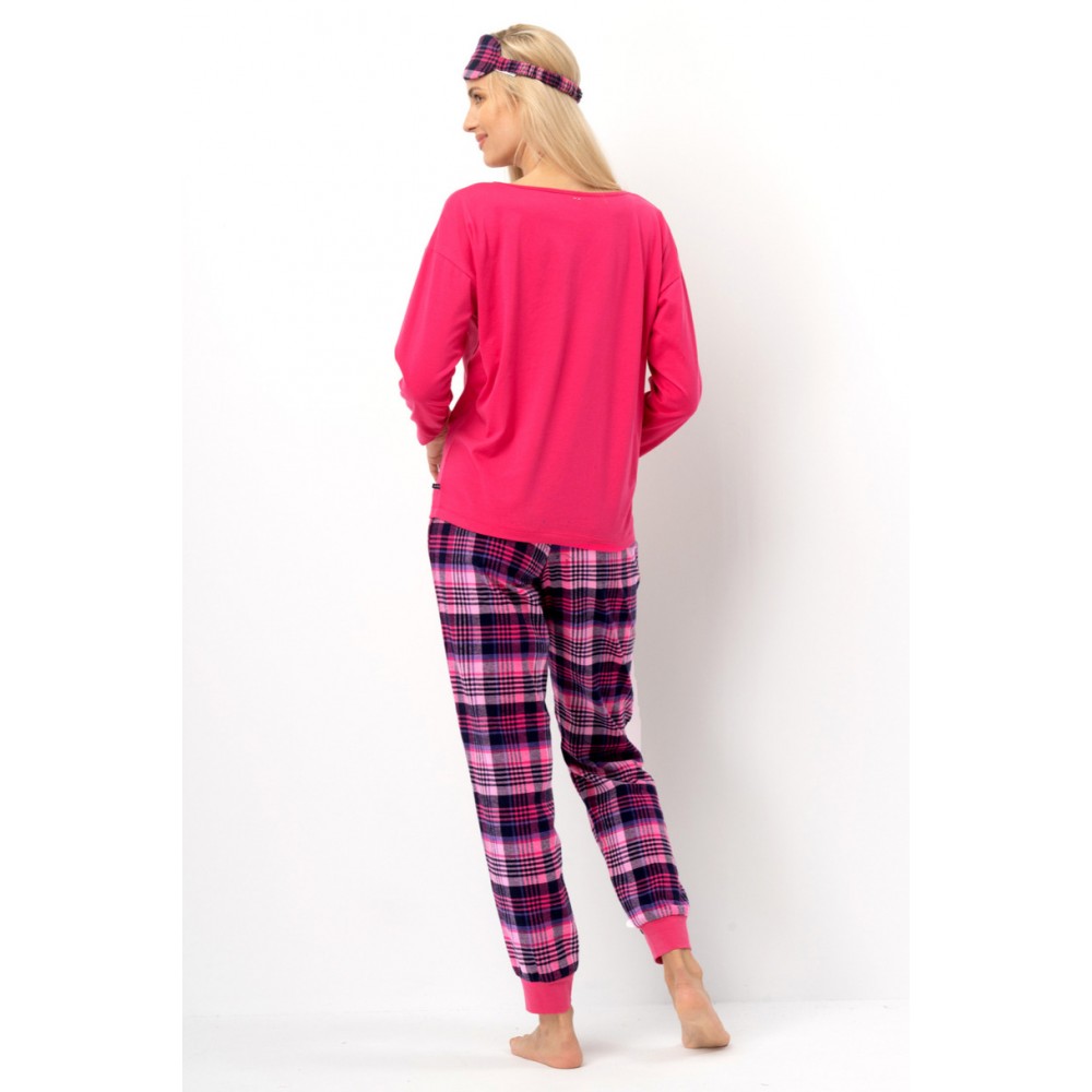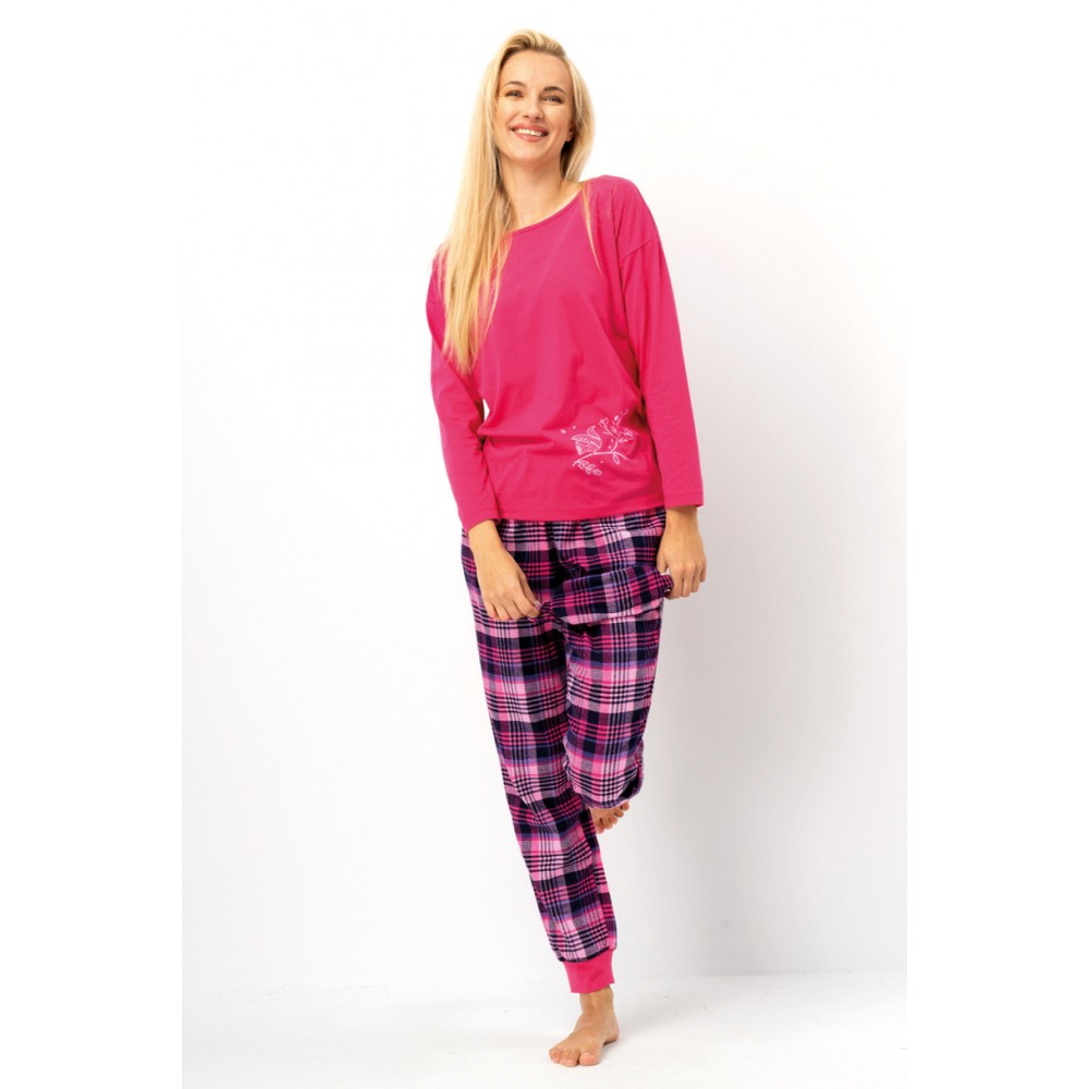 Жіноча піжама LNS 491 ідеально підійде жінкам, які цінують комфорт і стиль у затишку власного дому. Насичено-рожевий верх виготовлений з м’якої, приємної на дотик бавовни та має ніжний принт збоку. Вільний крій і довгі рукави забезпечують свободу рухів і тепловий комфорт. Штани з модним рожево-чорним візерунком у клітинку мають еластичну стрічку та еластичні манжети для ідеальної посадки та запобігають збиванню вночі. Цей комплект – ідеальний вибір для осінніх та зимових вечорів – як для сну, так і для лінивого ранку з кавою.