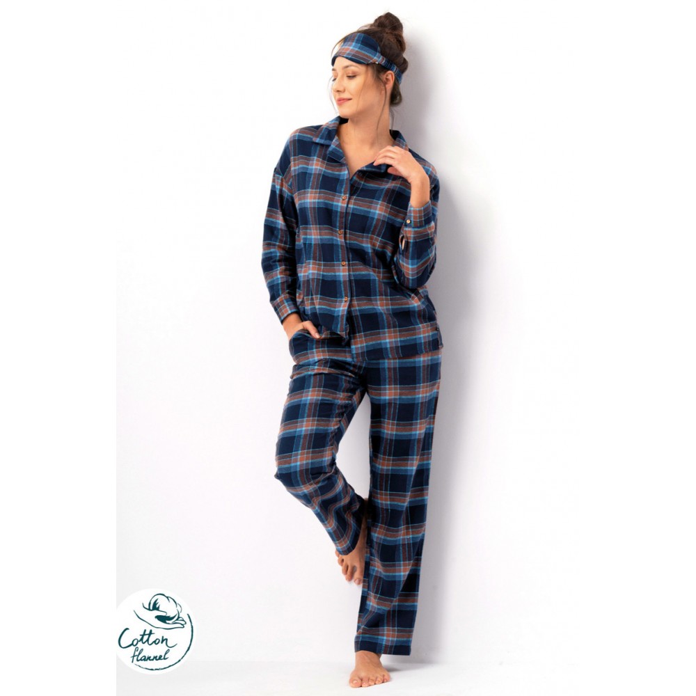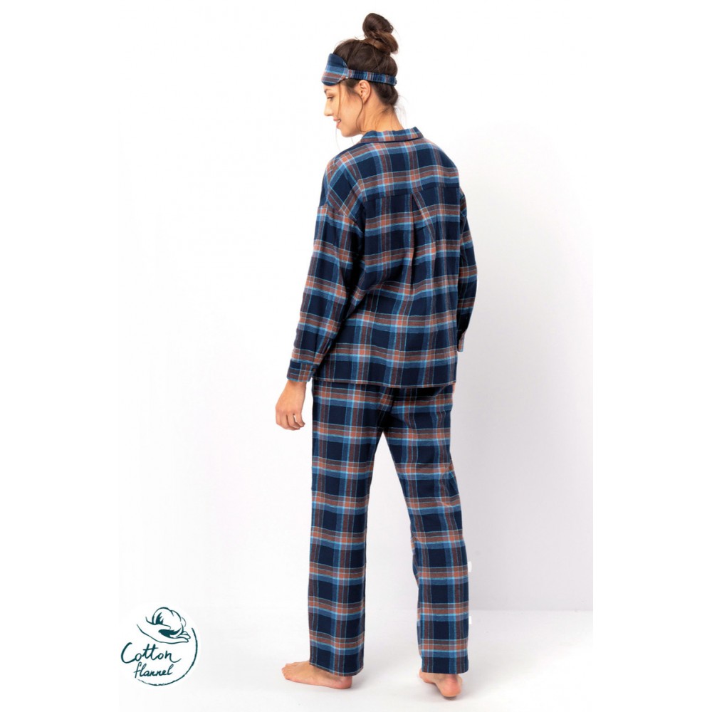 Ці жіночі піжами з м’якої бавовняної фланелі – ідеальний вибір для зимових вечорів та ранків. Їхній елегантний темно-синій та коричневий візерунок у клітинку надає їм класичного, позачасового вигляду. Верх сорочки на ґудзиках має комір та нагрудну кишеню, що поєднує комфорт з естетичною привабливістю. Штани прямого крою з еластичним поясом забезпечують свободу рухів та комфорт під час сну. У комплект входить маска для очей, що дозволяє насолоджуватися спокійним нічним сном без перерв. Цей комплект поєднує в собі практичність, тепло та жіночний стиль.